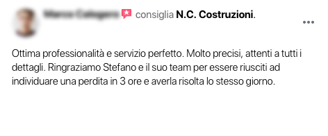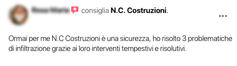 Noi di N.C Costruzioni, garantiamo al 100% per i nostri interventi, siamo sicuri che il problema dopo il nostro intervento non si ripresenti più.